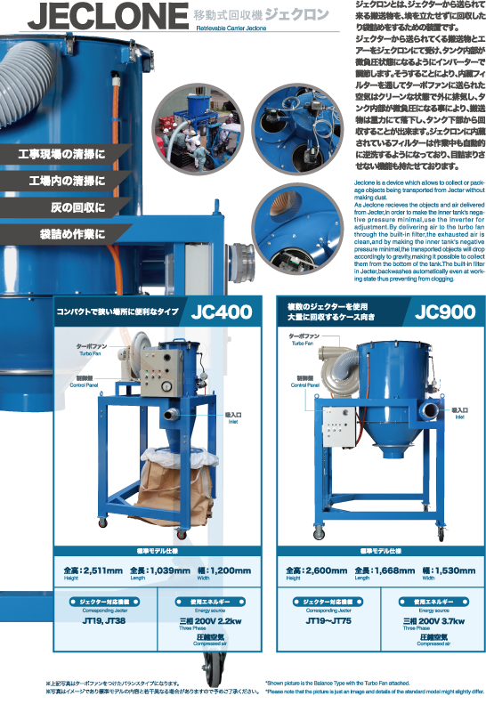 ジェクターと組合せて、粉・粉体や粉塵を搬送・回収出来る様設計された機械です。エアーフィルターとダブルテーパーサイクロン方式のジェクロンエアフィルターはタイマー付エアパルスにより定期的に逆噴射され目詰まりなく連続で吸引・回収が可能です。